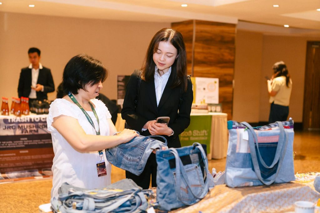 会場にはフィリピンのSMEによるブースも並び、食物残渣を活用したきのこ製品や、デニムのアップサイクルと障害者就労を結びつけた雑貨づくりなど、社会課題解決型ビジネスの現場に直接触れる機会が提供されました。参加者は、出展者から事業立ち上げの背景や直面した困難、そして事業の意義について、具体的な説明を聞くことができました。