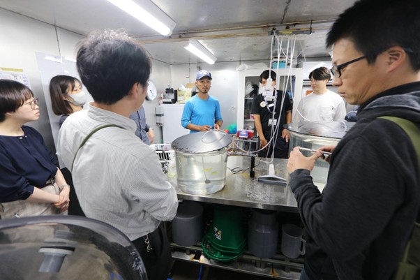 その後は日置市吹上浜沿岸に移動しました。Iターン移住し漁師として活動する佐々祐一氏に、特産品である月日貝の養殖現場を案内いただきました。養殖試験場では、月日貝を幼生から生育する過程を見学し、温暖化の影響を踏まえた生産拡大の展望について伺いました。参加者は実際に月日貝を試食し、地域の漁業が持つ可能性を舌でも感じる機会となりました。