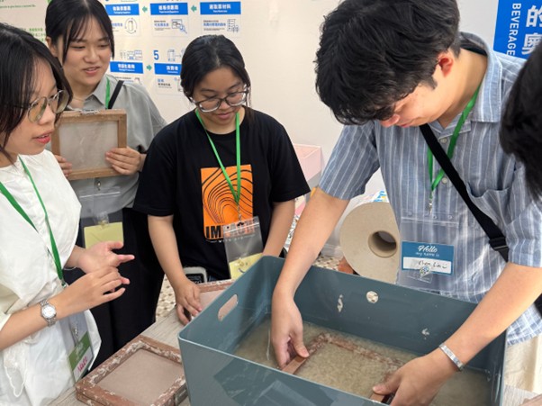 その後は、紙の再利用繊維を用いてリサイクルペーパーを作成するワークショップを体験しました。スタッフの方が丁寧に工程を解説してくださいましたが、実際に体験してみると、紙の厚さや質感を均一に仕上げることが意外に難しく、リサイクル工程の繊細さを実感しました。実際のリサイクル紙づくりを自ら体験することで、資源循環の重要性と現場での工夫の大切さを改めて学ぶ貴重な機会となりました。